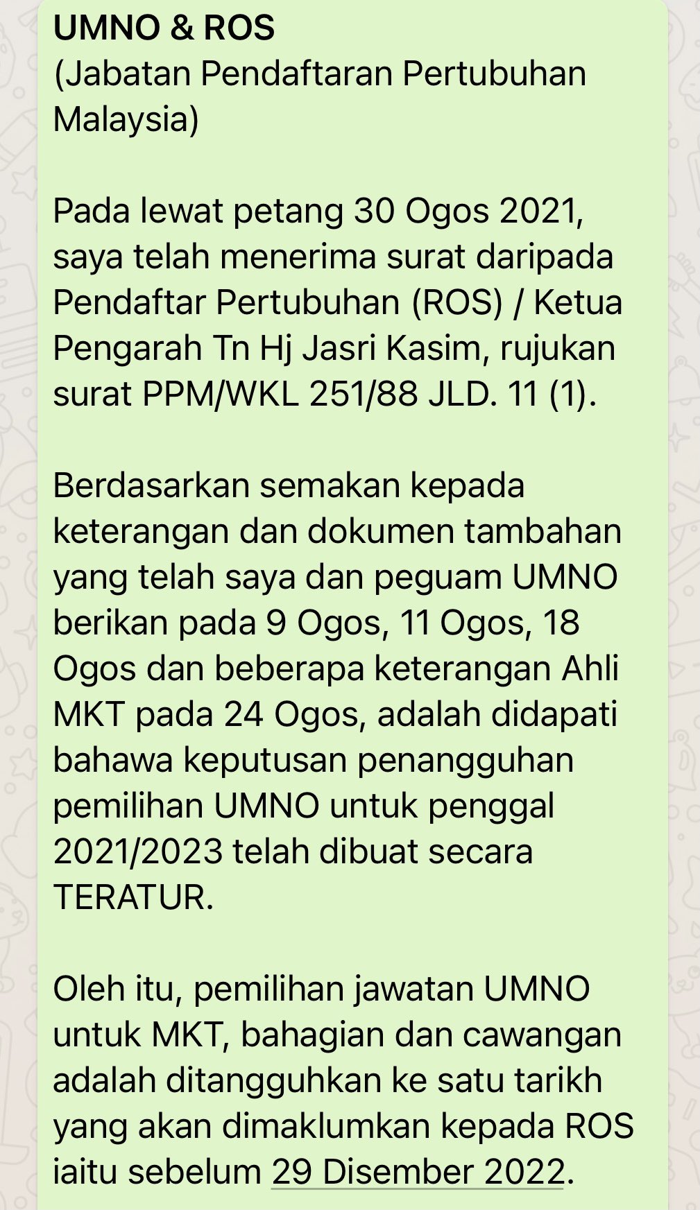 Ahmad B Maslan On Twitter Kenyataan Media Saya Mengenai Umno Ros Jabatan Pendaftar Pertubuhan Malaysia Berhubung Penangguhan Pemilihan Umno Bertarikh 30 8 21 Untuk Makluman Semua Terima Kasih Https T Co 2a6mg6uubg